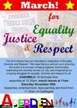Please come along and join us at the St Andrew’s Day March and Rally, on Saturday 30th November in Aberdeen, to give a clear message that racism and fascism are not welcome here in Aberdeenshire.