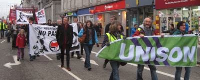 The St Andrew’s Day March and Rally was organised by the Aberdeen Trades Union Council along with community groups including Aberdeen Anti Fascist Alliance and Aberdeen Scottish Palestinian Solidarity Campaign. It made a colourful scene as the banners, UNISON’s amongst them, snaked down Union Street to the Rally at Marischall College.