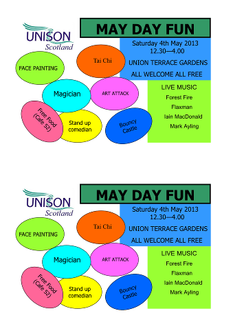 11.30am down the full length of Union Street, to a Rally in the Castlegate at 12noon where there will be speeches from local representatives. Brian Carroll, President of the ATUC urged union members, their families and friends, and community activists to attend the march and rally in numbers. He said, "This is the first time in many years that the marchers will be able to march the whole length of Union Street so it is really important that as many trades union and community activists as possible turn out. "Please bring your banners, flags, pendants and signs to make the march and rally as colourful as possible." May Day Fun Day