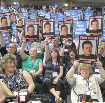 Call for Justice for Colombia Delegates took part in a photo shoot, calling for the release of Huber Ballesteros and his colleagues, imprisoned for their trade union activities. In a moving debate, speakers, including Ruth Young, a member from Falkirk, told of how Martha Diaz, an international guest, faced death threats and the kidnapping of the her daughter, because of her trade union activities. "I'm not sure I would be that brave," said Ruth, calling on delegates to "Embrace Martha's spirit and her fight." The branch motions did not make the conference agenda this year, and none of our delegates were up speaking at this Conference. However, the three new delegates, Kathleen Kennedy, Ann Gray and James Mulholland, very much enjoyed the conference experience.