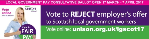 UNISON, and other local authority trade unions, lodged a pay claim with the Scottish employers in August 2016. See pay claim.